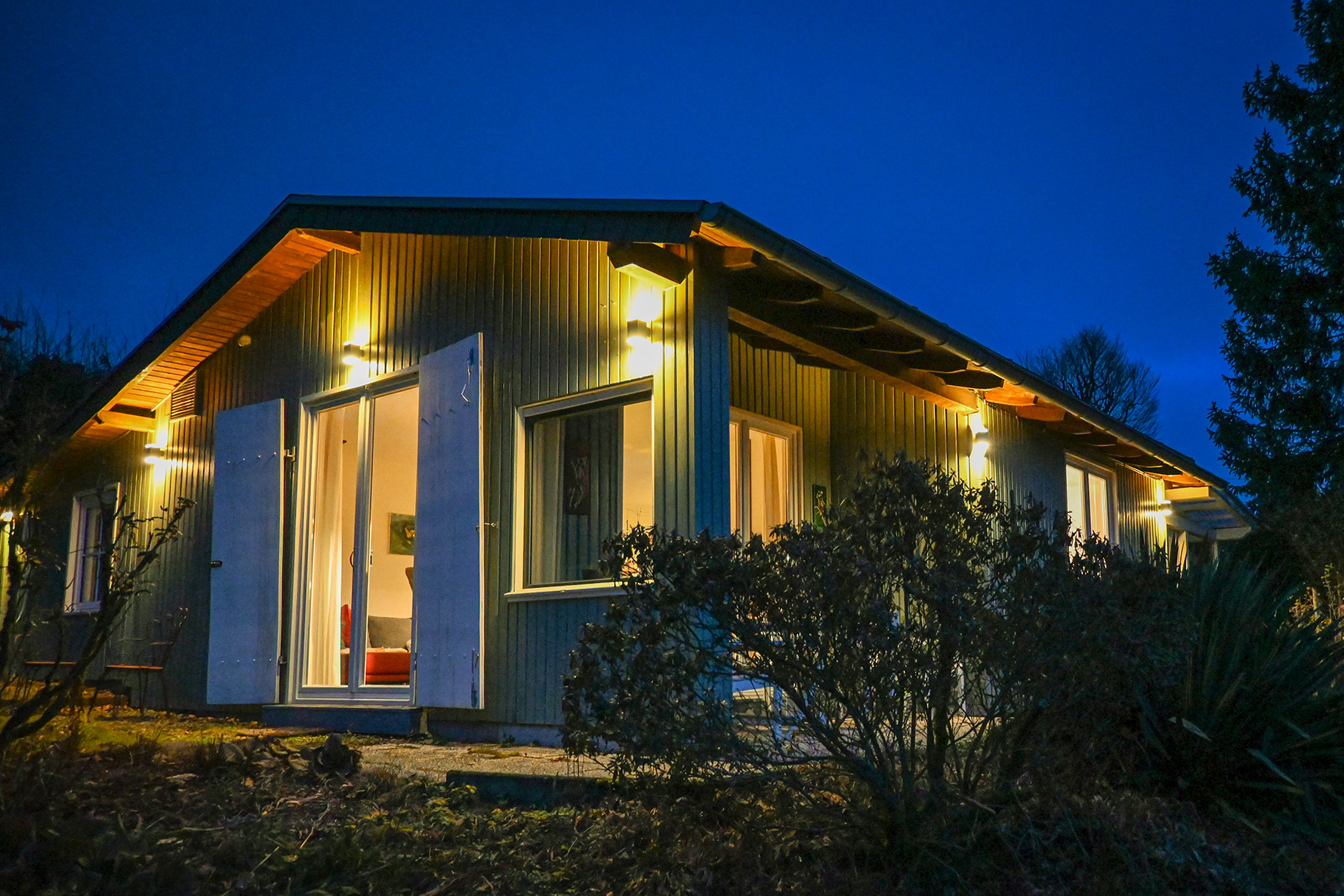 Die schöne Bleibe, ein Dreiklang von Natur, Genuss und Wellness. Umgeben von bewaldeten Hügeln, grünen Wiesen und Weiden, weit ab vom Lärm der Straßen fällt schon nach kurzem Aufenthalt die Alltagsspannung ab. Von der Sauna mit großem Fenster blickt man in den Garten. Das Haus ist individuell und hell gestaltet. Es verfügt über eine große offene Wohnküche mit Kaminofen. Von den beiden Schlafzimmer hat man eine schöne Aussicht über die Hügel und Weiden. Der große Garten bietet viel Platz und Kinder können sich hier, vom Straßenverkehr ungefährdet, bewegen. Nach unseren Erfahrungen mit der „Auszeit mit Weitblick“ machen Kinder aus dem weitläufigen Gelände gerne einen Abenteuerspielplatz.